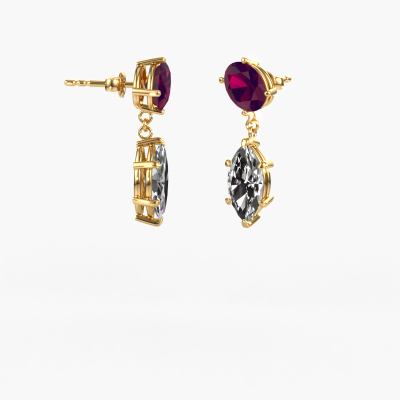 This is our set of modern Toi et Moi OVL-MRQ drop earrings. In this example the drop earrings are set with oval rhodolite. Each of our rhodolite gemstones is carefully selected and positioned in your drop earrings with great precision so light hits the rhodolite from every angle. We believe these affordable gold drop earrings look best set with coloured gemstones. But that is entirely up to you. How do you like these modern gold drop earrings? Simply customize this Toi et Moi OVL-MRQ drop earrings, using our online tool. Subsequently, your personal affordable Toi et Moi OVL-MRQ drop earrings will be made by hand by our goldsmiths. Precious metals and gemstones can be customized to your liking. Do you have specific preferences which are unavailable in our online tool? Please feel free to contact us. We will customize your personal modern drop earrings to your liking.After receiving your order, our goldsmiths will passionately start the creative process of making your drop earrings in our own studio. Because we don't have a big stockpile, these costs will not be passed on to you. Our pricing is proof of that! We offer top quality jewels at lowest price, guaranteed.To make it easier for you, we offer a 30 day return policy. Check our terms and conditions.