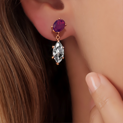 This is our set of modern Toi et Moi OVL-MRQ drop earrings. In this example the drop earrings are set with oval rhodolite. Each of our rhodolite gemstones is carefully selected and positioned in your drop earrings with great precision so light hits the rhodolite from every angle. We believe these affordable rose gold drop earrings look best set with coloured gemstones. But that is entirely up to you. How do you like these modern rose gold drop earrings? Simply customize this Toi et Moi OVL-MRQ drop earrings, using our online tool. Subsequently, your personal affordable Toi et Moi OVL-MRQ drop earrings will be made by hand by our goldsmiths. Precious metals and gemstones can be customized to your liking. Do you have specific preferences which are unavailable in our online tool? Please feel free to contact us. We will customize your personal modern drop earrings to your liking.After receiving your order, our goldsmiths will passionately start the creative process of making your drop earrings in our own studio. Because we don't have a big stockpile, these costs will not be passed on to you. Our pricing is proof of that! We offer top quality jewels at lowest price, guaranteed.To make it easier for you, we offer a 30 day return policy. Check our terms and conditions.