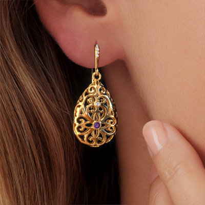 How would you describe your style? Are you looking for something slightly different? These unique filigree gold drop earrings are unique and created by our expert goldsmiths. These unique drop earrings are set with amethyst. Each of the amethysten is carefully selected, because we believe your drop earrings should be adorned with nothing but the most exquisite gemstones. Wouldn't you agree? The Idalia 2 earrings are unique pieces of jewellery because they can be customized to your liking.. Our goldsmiths passionately create your customized drop earrings to your liking with the utmost care. The gold set drop earrings, as shown here, can be customized using our online tool. Feel free to ask our jewel designers for assistance if you want changes made which are unavailable in our online tool. We are happy to answer your questions.After receiving your order, our goldsmiths will start the creative process of making your Idalia 2 drop earrings. We don't keep stock. This is advantageous because these costs will not be passed on to you. Therefore, we can offer jewellery at exceptionally low prices. To make it easier for you, we offer a 30 day return policy. Check our terms and conditions.