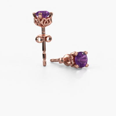 The solitaire rose gold Ize earrings are set with stunning round amethysten. These earrings are ideally combined with coloured gemstones, but if you prefer other gemstones, feel free to choose from our collection. Our expert jewellers would love to create handmade earrings for you in our own crafting studio. We use a unique concept, a perfect combination of ancient craftsmanship and the latest modern techniques. This enables us to design your earrings to perfection. The earrings, as shown here, are set with amethyst 5 mm. The best part of these solitaire earrings is that you can customize it to your own liking. Your style, your choice, your earrings. On top of that, your vintage rose gold earrings will be made by hand with eco-friendly materials! Please feel free to easily customize the earrings, using our online tool.De Ize earrings are made just for you by our master goldsmith in our own artisan studio.Are you on a budget? Please feel free to contact us, so we can go discuss your options. We offer our earrings at guaranteed best price, because we make them to order. You won't find such a price anywhere else!To make it easier for you, we offer a 30 day return policy. Check our terms and conditions.