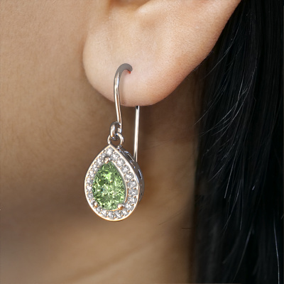 This is our set of trendy Beverlee 1 drop earrings. In this example the drop earrings are set with pear green lab grown diamond. Each of our green lab grown diamonds gemstones is carefully selected and positioned in your drop earrings with great precision so light hits the green lab grown diamond from every angle. We believe these drop white gold drop earrings look best set with coloured gemstones. But that is entirely up to you. Our goldsmiths passionately create your customized drop earrings to your liking with the utmost care. The white gold set drop earrings, as shown here, can be customized using our online tool. Feel free to ask our jewel designers for assistance if you want changes made which are unavailable in our online tool. We are happy to answer your questions.After receiving your order, our goldsmiths will passionately start the creative process of making your drop earrings in our own studio. Because we don't have a big stockpile, these costs will not be passed on to you. Our pricing is proof of that! We offer top quality jewels at lowest price, guaranteed.To make it easier for you, we offer a 30 day return policy. Check our terms and conditions.