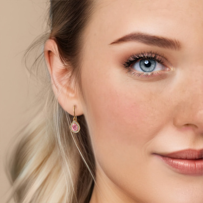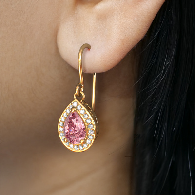 This is our set of trendy Beverlee 1 drop earrings. In this example the drop earrings are set with pear pink lab grown diamond. Each of our pink lab grown diamonds gemstones is carefully selected and positioned in your drop earrings with great precision so light hits the pink lab grown diamond from every angle. We believe these drop gold drop earrings look best set with coloured gemstones. But that is entirely up to you. Our goldsmiths passionately create your customized drop earrings to your liking with the utmost care. The gold set drop earrings, as shown here, can be customized using our online tool. Feel free to ask our jewel designers for assistance if you want changes made which are unavailable in our online tool. We are happy to answer your questions.After receiving your order, our goldsmiths will passionately start the creative process of making your drop earrings in our own studio. Because we don't have a big stockpile, these costs will not be passed on to you. Our pricing is proof of that! We offer top quality jewels at lowest price, guaranteed.To make it easier for you, we offer a 30 day return policy. Check our terms and conditions.