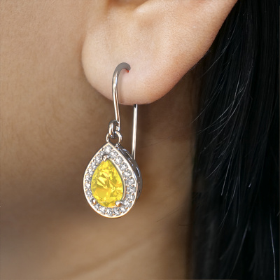 This is our set of trendy Beverlee 1 drop earrings. In this example the drop earrings are set with pear yellow sapphire. Each of our yellow sapphire gemstones is carefully selected and positioned in your drop earrings with great precision so light hits the yellow sapphire from every angle. We believe these drop platinum drop earrings look best set with coloured gemstones. But that is entirely up to you. Our goldsmiths passionately create your customized drop earrings to your liking with the utmost care. The platinum set drop earrings, as shown here, can be customized using our online tool. Feel free to ask our jewel designers for assistance if you want changes made which are unavailable in our online tool. We are happy to answer your questions.After receiving your order, our goldsmiths will passionately start the creative process of making your drop earrings in our own studio. Because we don't have a big stockpile, these costs will not be passed on to you. Our pricing is proof of that! We offer top quality jewels at lowest price, guaranteed.To make it easier for you, we offer a 30 day return policy. Check our terms and conditions.