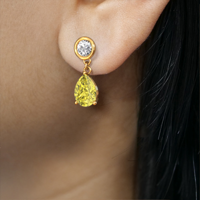 What could possibly be more stunning than a pair of stunning drop earrings? These gold Lacey PER drop earrings are a true eye-catcher. These graceful drop earrings are set with pear yellow lab grown diamond. We collaborate with the best suppliers of gemstones and they select our gemstones with great care. Your drop earrings are made by hand in our own artisan studio by our expert goldsmiths. Customized fantasy graceful drop earrings are the perfect gift! New exquisite designs are added daily by our team of passionate goldsmiths. And each design can be customized. Simply customize the precious metals and the colour of gemstones which will be used, for example. This makes your design of the fantasy Lacey PER drop earrings truly unique!After receiving your order, our goldsmiths will passionately start the creative process of making your drop earrings in our own studio. Because we don't have a big stockpile, these costs will not be passed on to you. Our pricing is proof of that! We offer top quality jewels at lowest price, guaranteed.To make it easier for you, we offer a 30 day return policy. Check our terms and conditions.