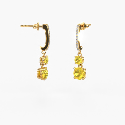 What could possibly be more stunning than a pair of stunning drop earrings? These gold Tanja 2 drop earrings are a true eye-catcher. These hanging drop earrings are set with round yellow sapphire. We collaborate with the best suppliers of gemstones and they select our gemstones with great care. Your drop earrings are made by hand in our own artisan studio by our expert goldsmiths. The best part of these hanging drop earrings is that you can customize it to your own liking. Your style, your choice, your drop earrings. On top of that, your exclusive gold drop earrings will be made by hand with eco-friendly materials! Please feel free to easily customize the drop earrings, using our online tool.Because we design and deliver our own drop earrings, we can offer you drop earrings at a price you won't find anywhere else. drop earrings are made to order, which helps prevent excess supplies, so we can make you a great price offer. We understand it feels risky, buying your drop earrings online, but we will gladly assist in the designing process, taking your budget into consideration.To make it easier for you, we offer a 30 day return policy. Check our terms and conditions.