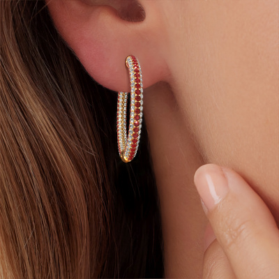 With a pair of exclusive hoop earrings, every woman truly stands out. At DiamondsByMe, we create exclusive and extraordinary jewellery and we make use of the finest precious metals and gemstones. These exclusive gold hoop earrings are a true work of art! Each tiny detail has been made with patience and passion by our expert jeweller. This requires a keen eye and skilful hand in order for the ring to be carefully created to perfection. And this is exactly what our expert jewellers strive for, perfection! The exquisite ruby are set in a way making them seem to shine even brighter. This gives the hoop earrings an extra glamorous look. Shown above are our gold Hope 20mm hoop earrings, set with round ruby. The Hope 20mm earrings are passionately made by one of our master goldsmiths.. How do you like these exclusive gold hoop earrings? Simply customize this Hope 20mm hoop earrings, using our online tool. Subsequently, your personal best prices Hope 20mm hoop earrings will be made by hand by our goldsmiths. Precious metals and gemstones can be customized to your liking. Do you have specific preferences which are unavailable in our online tool? Please feel free to contact us. We will customize your personal exclusive hoop earrings to your liking. Are you on a budget? Please feel free to contact us, so we can go discuss your options. We offer our hoop earrings at guaranteed best price, because we make them to order. You won't find such a price anywhere else! To make it easier for you, we offer a 30 day return policy. Check our terms and conditions.