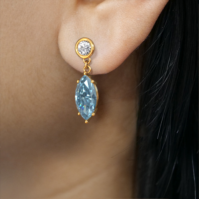 What could possibly be more stunning than a pair of stunning drop earrings? These gold Lacey MRQ drop earrings are a true eye-catcher. These affordable drop earrings are set with marquise blue lab grown diamond. We collaborate with the best suppliers of gemstones and they select our gemstones with great care. Your drop earrings are made by hand in our own artisan studio by our expert goldsmiths. The best part of these affordable drop earrings is that you can customize it to your own liking. Your style, your choice, your drop earrings. On top of that, your modern gold drop earrings will be made by hand with eco-friendly materials! Please feel free to easily customize the drop earrings, using our online tool.By using our modern techniques, we can design and customize the finest quality jewels with the utmost care for you. Our drop earrings are always priced 30 percent lower than other jewellers. We make drop earrings to order so we don't have to maintain a large stock. If you have a certain budget, we are more than happy to advice you accordingly.To make it easier for you, we offer a 30 day return policy. Check our terms and conditions.