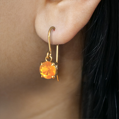 This is our set of classic Laurie RND 1 drop earrings. In this example the drop earrings are set with round citrin. Each of our citrin gemstones is carefully selected and positioned in your drop earrings with great precision so light hits the citrin from every angle. We believe these solitaire gold drop earrings look best set with coloured gemstones. But that is entirely up to you. As soon as you finished designing your classic drop earrings with our online tool, our goldsmiths will start their creative process of making your drop earrings. This will be done with passion and care, according ancient crafting. On top of that, our jewels are made of eco-friendly materials. If you want specific changes made to your Laurie RND 1 drop earrings, that are unavailable in our online tool, please feel free to contact our expert designers.Are you on a budget? Please feel free to contact us, so we can go discuss your options. We offer our drop earrings at guaranteed best price, because we make them to order. You won't find such a price anywhere else!To make it easier for you, we offer a 30 day return policy. Check our terms and conditions.