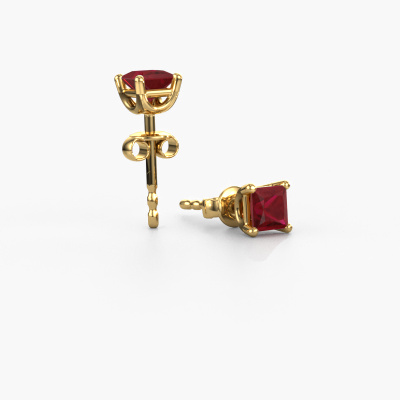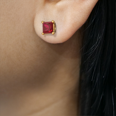 Solitaire stud earrings are contemporary yet fashionable pieces of jewellery. In solitaire stud earrings, the prong setting is open and only 1 stone is set, which helps reflect light on the gemstone from every angle. Because the ruby are positioned higher, these contemporary stud earrings become truly eye-catching. We carefully create each detail of these solitaire stud earrings by hand. Our expert goldsmiths set the ruby in these gold stud earrings with the utmost precision, so light reflects evenly from every angle. The stud earrings are set with 4 mm princess ruby. The Sam SQR earrings are made to embellish your ears. Each jewel is lovingly made by hand by our goldsmiths.. Our goldsmiths passionately create your customized stud earrings to your liking with the utmost care. The gold set stud earrings, as shown here, can be customized using our online tool. Feel free to ask our jewel designers for assistance if you want changes made which are unavailable in our online tool. We are happy to answer your questions. By using a combination of the latest modern techniques, combined with ancient crafting, we can make all our stud earrings in our own studio. Each jewel is made to order. This is advantageous because we can offer you a price you won't find anywhere else. To make it easier for you, we offer a 30 day return policy. Check our terms and conditions.