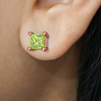 Solitaire stud earrings are contemporary yet fashionable pieces of jewellery. In solitaire stud earrings, the prong setting is open and only 1 stone is set, which helps reflect light on the gemstone from every angle. Because the peridot are positioned higher, these contemporary stud earrings become truly eye-catching. We carefully create each detail of these solitaire stud earrings by hand. Our expert goldsmiths set the peridot in these rose gold stud earrings with the utmost precision, so light reflects evenly from every angle. The stud earrings are set with 4 mm princess peridot. The Sam square earrings are made to embellish your ears. Each jewel is lovingly made by hand by our goldsmiths.. Our goldsmiths passionately create your customized stud earrings to your liking with the utmost care. The rose gold set stud earrings, as shown here, can be customized using our online tool. Feel free to ask our jewel designers for assistance if you want changes made which are unavailable in our online tool. We are happy to answer your questions. By using a combination of the latest modern techniques, combined with ancient crafting, we can make all our stud earrings in our own studio. Each jewel is made to order. This is advantageous because we can offer you a price you won't find anywhere else. To make it easier for you, we offer a 30 day return policy. Check our terms and conditions.