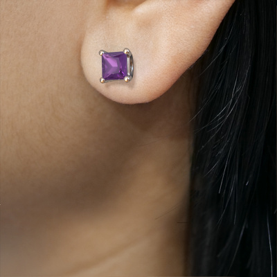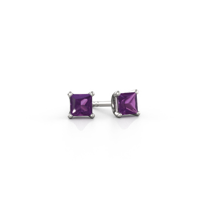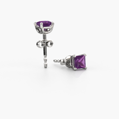 Solitaire stud earrings are contemporary yet fashionable pieces of jewellery. In solitaire stud earrings, the prong setting is open and only 1 stone is set, which helps reflect light on the gemstone from every angle. Because the amethysten are positioned higher, these contemporary stud earrings become truly eye-catching. We carefully create each detail of these solitaire stud earrings by hand. Our expert goldsmiths set the amethysten in these white gold stud earrings with the utmost precision, so light reflects evenly from every angle. The stud earrings are set with 4 mm princess amethysten. The Sam square earrings are made to embellish your ears. Each jewel is lovingly made by hand by our goldsmiths.. Our goldsmiths passionately create your customized stud earrings to your liking with the utmost care. The white gold set stud earrings, as shown here, can be customized using our online tool. Feel free to ask our jewel designers for assistance if you want changes made which are unavailable in our online tool. We are happy to answer your questions. By using a combination of the latest modern techniques, combined with ancient crafting, we can make all our stud earrings in our own studio. Each jewel is made to order. This is advantageous because we can offer you a price you won't find anywhere else. To make it easier for you, we offer a 30 day return policy. Check our terms and conditions.