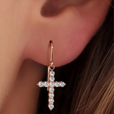 This is our set of fantasy Cross drop earrings. In this example the drop earrings are set with round lab grown diamond. Each of our lab-grown diamonds gemstones is carefully selected and positioned in your drop earrings with great precision so light hits the lab grown diamond from every angle. We believe these symbolic rose gold drop earrings look best set with coloured gemstones. But that is entirely up to you. The best part of these symbolic drop earrings is that you can customize it to your own liking. Your style, your choice, your drop earrings. On top of that, your fantasy rose gold drop earrings will be made by hand with eco-friendly materials! Please feel free to easily customize the drop earrings, using our online tool.After receiving your order, our goldsmiths will passionately start the creative process of making your drop earrings in our own studio. Because we don't have a big stockpile, these costs will not be passed on to you. Our pricing is proof of that! We offer top quality jewels at lowest price, guaranteed.To make it easier for you, we offer a 30 day return policy. Check our terms and conditions.