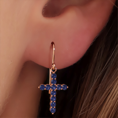 This is our set of fantasy Cross drop earrings. In this example the drop earrings are set with round sapphire. Each of our sapphire gemstones is carefully selected and positioned in your drop earrings with great precision so light hits the sapphire from every angle. We believe these symbolic rose gold drop earrings look best set with coloured gemstones. But that is entirely up to you. The best part of these symbolic drop earrings is that you can customize it to your own liking. Your style, your choice, your drop earrings. On top of that, your fantasy rose gold drop earrings will be made by hand with eco-friendly materials! Please feel free to easily customize the drop earrings, using our online tool.After receiving your order, our goldsmiths will passionately start the creative process of making your drop earrings in our own studio. Because we don't have a big stockpile, these costs will not be passed on to you. Our pricing is proof of that! We offer top quality jewels at lowest price, guaranteed.To make it easier for you, we offer a 30 day return policy. Check our terms and conditions.