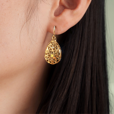 How would you describe your style? Are you looking for something slightly different? These unique filigree gold drop earrings are unique and created by our expert goldsmiths. These unique drop earrings are set with yellow sapphire. Each of the yellow sapphire is carefully selected, because we believe your drop earrings should be adorned with nothing but the most exquisite gemstones. Wouldn't you agree? The Idalia 2 earrings are unique pieces of jewellery because they can be customized to your liking.. Our goldsmiths passionately create your customized drop earrings to your liking with the utmost care. The gold set drop earrings, as shown here, can be customized using our online tool. Feel free to ask our jewel designers for assistance if you want changes made which are unavailable in our online tool. We are happy to answer your questions.After receiving your order, our goldsmiths will start the creative process of making your Idalia 2 drop earrings. We don't keep stock. This is advantageous because these costs will not be passed on to you. Therefore, we can offer jewellery at exceptionally low prices. To make it easier for you, we offer a 30 day return policy. Check our terms and conditions.