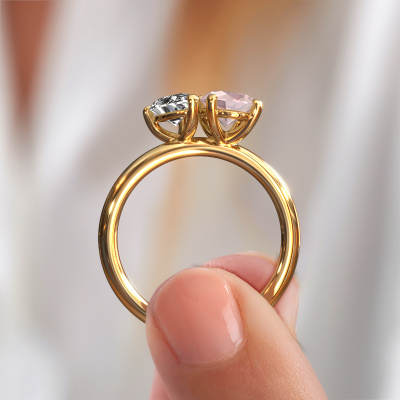 This 14 Carat gold ring is called Toi et Moi OVL-PER and is set with morganite champagne. Do you keep up with the latest fashion trends? Do you want a unique engagement ring that matches your lifestyle? This charming engagement ring is an extraordinary ring which can be custom-made to fit your or her personal style. This fashionable gold engagement ring is set with morganite champagne. Our morganite champagne are carefully selected for this specific ring in order to create the best effect. Our expert goldsmith will create your ring in our own artisan studio where the morganite champagne will be set with great care. The ring will then be polished to perfection. Nothing but the best for the love of your life! This jewel is made just for you by our master goldsmiths in our own studio.By using our modern techniques, we can design and customize the finest quality jewels with the utmost care for you. Our engagement rings are always priced 30 percent lower than other jewellers. We make engagement rings to order so we don't have to maintain a large stock. If you have a certain budget, we are more than happy to advice you accordingly.Do you have a specific ring in mind? One you came across somewhere. Please feel free to tell us your wishes and we will turn your design into a unique engagement ring. You can follow the development of your ring design because we use 3D drawings. This gives you a realistic preview of your design. We will gladly send you a non-binding offer, based on a fair price/ quality ratio. It will amaze you.To make it easier for you, we offer a 30 day return policy. Check our terms and conditions.