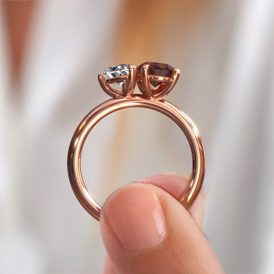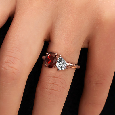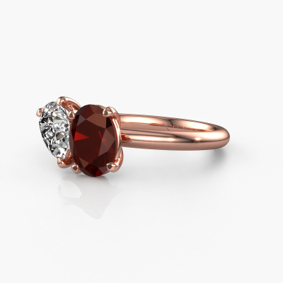 This 14 Carat rose gold ring is called Toi et Moi OVL-PER and is set with garnet. Do you keep up with the latest fashion trends? Do you want a unique engagement ring that matches your lifestyle? This charming engagement ring is an extraordinary ring which can be custom-made to fit your or her personal style. This fashionable rose gold engagement ring is set with garnet. Our garnet are carefully selected for this specific ring in order to create the best effect. Our expert goldsmith will create your ring in our own artisan studio where the garnet will be set with great care. The ring will then be polished to perfection. Nothing but the best for the love of your life! This jewel is made just for you by our master goldsmiths in our own studio.By using our modern techniques, we can design and customize the finest quality jewels with the utmost care for you. Our engagement rings are always priced 30 percent lower than other jewellers. We make engagement rings to order so we don't have to maintain a large stock. If you have a certain budget, we are more than happy to advice you accordingly.Do you have a specific ring in mind? One you came across somewhere. Please feel free to tell us your wishes and we will turn your design into a unique engagement ring. You can follow the development of your ring design because we use 3D drawings. This gives you a realistic preview of your design. We will gladly send you a non-binding offer, based on a fair price/ quality ratio. It will amaze you.To make it easier for you, we offer a 30 day return policy. Check our terms and conditions.