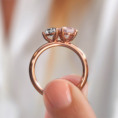 This 14 Carat rose gold ring is called Toi et Moi OVL-PER and is set with morganite champagne. Do you keep up with the latest fashion trends? Do you want a unique engagement ring that matches your lifestyle? This charming engagement ring is an extraordinary ring which can be custom-made to fit your or her personal style. This fashionable rose gold engagement ring is set with morganite champagne. Our morganite champagne are carefully selected for this specific ring in order to create the best effect. Our expert goldsmith will create your ring in our own artisan studio where the morganite champagne will be set with great care. The ring will then be polished to perfection. Nothing but the best for the love of your life! This jewel is made just for you by our master goldsmiths in our own studio.By using our modern techniques, we can design and customize the finest quality jewels with the utmost care for you. Our engagement rings are always priced 30 percent lower than other jewellers. We make engagement rings to order so we don't have to maintain a large stock. If you have a certain budget, we are more than happy to advice you accordingly.Do you have a specific ring in mind? One you came across somewhere. Please feel free to tell us your wishes and we will turn your design into a unique engagement ring. You can follow the development of your ring design because we use 3D drawings. This gives you a realistic preview of your design. We will gladly send you a non-binding offer, based on a fair price/ quality ratio. It will amaze you.To make it easier for you, we offer a 30 day return policy. Check our terms and conditions.