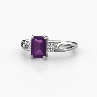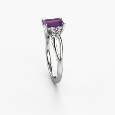 This platinum ring is called Amie EME and is set with 7x5 mm amethyst. This exclusive platinum 3-stone engagement ring is a true work of art! The ornaments are crafted with a lot of patience and great passion. In order to create this ring with great precision, this craft requires a keen eye and skilful hand. A challenge which ignites a fire in our expert goldsmith. The exquisite amethysten are set in a special way so they stand out even more. This gives the ring an even more glamorous appearance. The tasteful engagement ring is actually unique on its own because of the gemstones which we carefully select especially for this ring. On top of that you select the precious metals which will be used to create a unique ring for the most extraordinary woman in your life! This jewel is made to shine bright around your finger. Each jewel is hand made with love by our goldsmiths.Are you on a budget? Please feel free to contact us, so we can go discuss your options. We offer our engagement rings at guaranteed best price, because we make them to order. You won't find such a price anywhere else!Our team adds new designs to our online collection daily. Our designers and goldsmiths work together in creating the best design. We strive to offer a diverse collection of jewels. Perhaps you have a specific jewel design in mind. One you came across somewhere. Please contact us for a free consultation. We will make you an offer, based on a fair price/ quality ratio, that will baffle you.To make it easier for you, we offer a 30 day return policy. Check our terms and conditions.