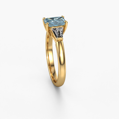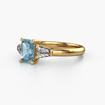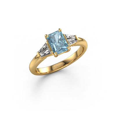 This 14 Carat gold ring is called Kina RAD and is set with 7x5 mm blue lab grown diamond. This exclusive gold 3-stone engagement ring is a true work of art! The ornaments are crafted with a lot of patience and great passion. In order to create this ring with great precision, this craft requires a keen eye and skilful hand. A challenge which ignites a fire in our expert goldsmith. The exquisite blue lab grown diamonds are set in a special way so they stand out even more. This gives the ring an even more glamorous appearance. The graceful engagement ring is actually unique on its own because of the gemstones which we carefully select especially for this ring. On top of that you select the precious metals which will be used to create a unique ring for the most extraordinary woman in your life! This jewel is made just for you, with attention to detail and design.After receiving your order, our goldsmiths will passionately start the creative process of making your engagement ring in our own studio. Because we don't have a big stockpile, these costs will not be passed on to you. Our pricing is proof of that! We offer top quality jewels at lowest price, guaranteed.Have you found a specific engagement ring somewhere which you would like to give to your loved one? Please feel free to express your wishes to our jewel designers because we would be honoured to turn your design into a unique engagement ring. You can follow the development of your ring design because we use 3D drawings. This gives you a realistic preview of how your design will look. You can also preorder a dummy. A dummy is a plastic ring, which can be shaped according your ring design. You can try it on and check if its width and size are suitable for you. We will gladly send you a non-binding offer, based on a fair price/ quality ratio. It will amaze you, considering the quality of the ring and gemstones.To make it easier for you, we offer a 30 day return policy. Check our terms and conditions.