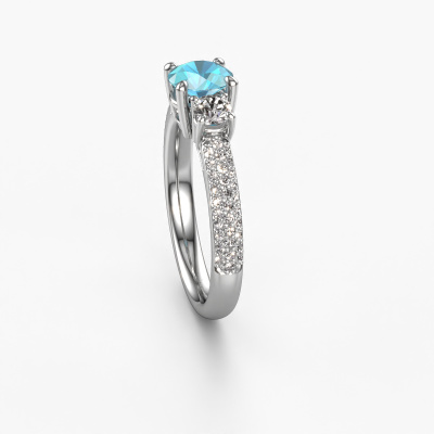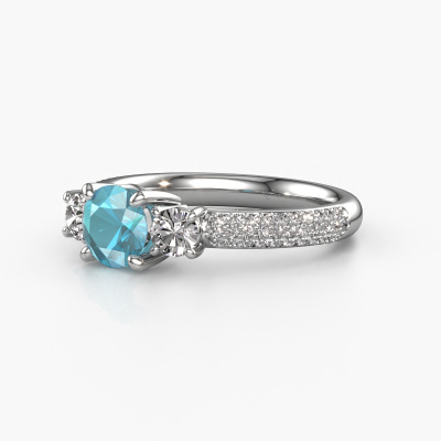 This platinum ring is called Marielle RND and is set with 6 mm blue topaz. This exclusive platinum 3-stone engagement ring is a true work of art! The ornaments are crafted with a lot of patience and great passion. In order to create this ring with great precision, this craft requires a keen eye and skilful hand. A challenge which ignites a fire in our expert goldsmith. The exquisite blue topaz are set in a special way so they stand out even more. This gives the ring an even more glamorous appearance. The tasteful engagement ring is actually unique on its own because of the gemstones which we carefully select especially for this ring. On top of that you select the precious metals which will be used to create a unique ring for the most extraordinary woman in your life! This jewel is made with passion and love by one of our master goldsmiths.By using a combination of the latest modern techniques, combined with ancient crafting, we can make all our engagement rings in our own studio. Each jewel is made to order. This is advantageous because we can offer you a price you won't find anywhere else.Our designers and goldsmiths work together each day, creating new jewels. Perhaps you have found a nice exclusive engagement ring somewhere, which can be used to customize your unique ring. Please feel free to contact us. We will make you an offer, based on a fair price/ quality ratio, which will amaze you.To make it easier for you, we offer a 30 day return policy. Check our terms and conditions.