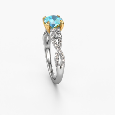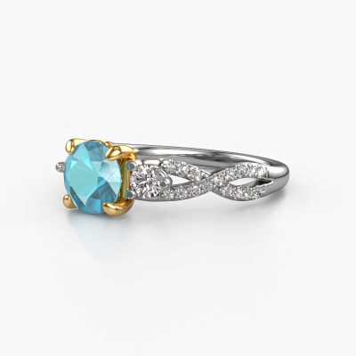 This 14 Carat white gold ring is called Marilou RND and is set with 6.5 mm blue topaz. This exclusive white gold 3-stone engagement ring is a true work of art! The ornaments are crafted with a lot of patience and great passion. In order to create this ring with great precision, this craft requires a keen eye and skilful hand. A challenge which ignites a fire in our expert goldsmith. The exquisite blue topaz are set in a special way so they stand out even more. This gives the ring an even more glamorous appearance. The split band engagement ring is actually unique on its own because of the gemstones which we carefully select especially for this ring. On top of that you select the precious metals which will be used to create a unique ring for the most extraordinary woman in your life! This jewel is made just for you, with attention to detail and design.Are you on a budget? Please feel free to contact us, so we can go discuss your options. We offer our engagement rings at guaranteed best price, because we make them to order. You won't find such a price anywhere else!Have you found a specific engagement ring somewhere which you would like to give to your loved one? Please feel free to express your wishes to our jewel designers because we would be honoured to turn your design into a fantasy engagement ring. You can follow the development of your ring design because we use 3D drawings. This gives you a realistic preview of how your design will look. You can also preorder a dummy. A dummy is a plastic ring, which can be shaped according your ring design. You can try it on and check if its width and size are suitable for you. We will gladly send you a non-binding offer, based on a fair price/ quality ratio. It will amaze you, considering the quality of the ring and gemstones.To make it easier for you, we offer a 30 day return policy. Check our terms and conditions.