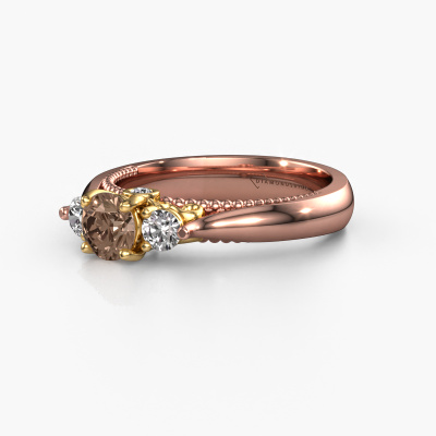 This 14 Carat rose gold ring is called Tiffani and is set with 0.74 crt brown diamond. This exclusive rose gold 3-stone engagement ring is a true work of art! The ornaments are crafted with a lot of patience and great passion. In order to create this ring with great precision, this craft requires a keen eye and skilful hand. A challenge which ignites a fire in our expert goldsmith. The exquisite brown diamonds are set in a special way so they stand out even more. This gives the ring an even more glamorous appearance. The ajour engagement ring is actually unique on its own because of the gemstones which we carefully select especially for this ring. On top of that you select the precious metals which will be used to create a unique ring for the most extraordinary woman in your life! This jewel is made just for you by our master goldsmiths in our own studio.After receiving your order, our goldsmiths will passionately start the creative process of making your engagement ring in our own studio. Because we don't have a big stockpile, these costs will not be passed on to you. Our pricing is proof of that! We offer top quality jewels at lowest price, guaranteed.Have you found a specific engagement ring somewhere which you would like to give to your loved one? Please feel free to express your wishes to our jewel designers because we would be honoured to turn your design into a unique engagement ring. You can follow the development of your ring design because we use 3D drawings. This gives you a realistic preview of how your design will look. You can also preorder a dummy. A dummy is a plastic ring, which can be shaped according your ring design. You can try it on and check if its width and size are suitable for you. We will gladly send you a non-binding offer, based on a fair price/ quality ratio. It will amaze you, considering the quality of the ring and gemstones.To make it easier for you, we offer a 30 day return policy. Check our terms and conditions.
