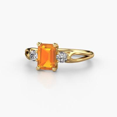 This 14 Carat gold ring is called Amie EME and is set with 7x5 mm citrin. This exclusive gold 3-stone engagement ring is a true work of art! The ornaments are crafted with a lot of patience and great passion. In order to create this ring with great precision, this craft requires a keen eye and skilful hand. A challenge which ignites a fire in our expert goldsmith. The exquisite citrin are set in a special way so they stand out even more. This gives the ring an even more glamorous appearance. The tasteful engagement ring is actually unique on its own because of the gemstones which we carefully select especially for this ring. On top of that you select the precious metals which will be used to create a unique ring for the most extraordinary woman in your life! This jewel is made to shine bright around your finger. Each jewel is hand made with love by our goldsmiths.Are you on a budget? Please feel free to contact us, so we can go discuss your options. We offer our engagement rings at guaranteed best price, because we make them to order. You won't find such a price anywhere else!Our team adds new designs to our online collection daily. Our designers and goldsmiths work together in creating the best design. We strive to offer a diverse collection of jewels. Perhaps you have a specific jewel design in mind. One you came across somewhere. Please contact us for a free consultation. We will make you an offer, based on a fair price/ quality ratio, that will baffle you.To make it easier for you, we offer a 30 day return policy. Check our terms and conditions.