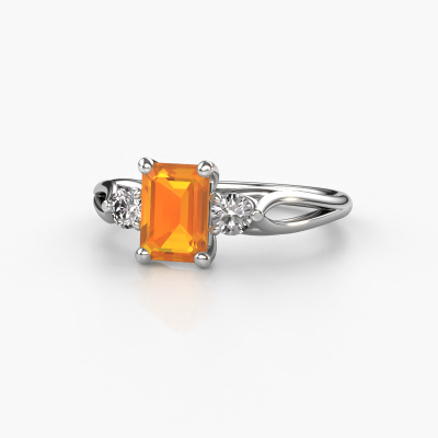 This platinum ring is called Amie EME and is set with 7x5 mm citrin. This exclusive platinum 3-stone engagement ring is a true work of art! The ornaments are crafted with a lot of patience and great passion. In order to create this ring with great precision, this craft requires a keen eye and skilful hand. A challenge which ignites a fire in our expert goldsmith. The exquisite citrin are set in a special way so they stand out even more. This gives the ring an even more glamorous appearance. The tasteful engagement ring is actually unique on its own because of the gemstones which we carefully select especially for this ring. On top of that you select the precious metals which will be used to create a unique ring for the most extraordinary woman in your life! This jewel is made to shine bright around your finger. Each jewel is hand made with love by our goldsmiths.Are you on a budget? Please feel free to contact us, so we can go discuss your options. We offer our engagement rings at guaranteed best price, because we make them to order. You won't find such a price anywhere else!Our team adds new designs to our online collection daily. Our designers and goldsmiths work together in creating the best design. We strive to offer a diverse collection of jewels. Perhaps you have a specific jewel design in mind. One you came across somewhere. Please contact us for a free consultation. We will make you an offer, based on a fair price/ quality ratio, that will baffle you.To make it easier for you, we offer a 30 day return policy. Check our terms and conditions.