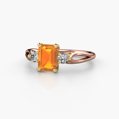 This 14 Carat rose gold ring is called Amie EME and is set with 7x5 mm citrin. This exclusive rose gold 3-stone engagement ring is a true work of art! The ornaments are crafted with a lot of patience and great passion. In order to create this ring with great precision, this craft requires a keen eye and skilful hand. A challenge which ignites a fire in our expert goldsmith. The exquisite citrin are set in a special way so they stand out even more. This gives the ring an even more glamorous appearance. The tasteful engagement ring is actually unique on its own because of the gemstones which we carefully select especially for this ring. On top of that you select the precious metals which will be used to create a unique ring for the most extraordinary woman in your life! This jewel is made to shine bright around your finger. Each jewel is hand made with love by our goldsmiths.Are you on a budget? Please feel free to contact us, so we can go discuss your options. We offer our engagement rings at guaranteed best price, because we make them to order. You won't find such a price anywhere else!Our team adds new designs to our online collection daily. Our designers and goldsmiths work together in creating the best design. We strive to offer a diverse collection of jewels. Perhaps you have a specific jewel design in mind. One you came across somewhere. Please contact us for a free consultation. We will make you an offer, based on a fair price/ quality ratio, that will baffle you.To make it easier for you, we offer a 30 day return policy. Check our terms and conditions.