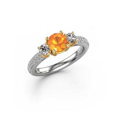 This 14 Carat white gold ring is called Marielle RND and is set with 6 mm citrin. This exclusive white gold 3-stone engagement ring is a true work of art! The ornaments are crafted with a lot of patience and great passion. In order to create this ring with great precision, this craft requires a keen eye and skilful hand. A challenge which ignites a fire in our expert goldsmith. The exquisite citrin are set in a special way so they stand out even more. This gives the ring an even more glamorous appearance. The tasteful engagement ring is actually unique on its own because of the gemstones which we carefully select especially for this ring. On top of that you select the precious metals which will be used to create a unique ring for the most extraordinary woman in your life! This jewel is made with passion and love by one of our master goldsmiths.By using a combination of the latest modern techniques, combined with ancient crafting, we can make all our engagement rings in our own studio. Each jewel is made to order. This is advantageous because we can offer you a price you won't find anywhere else.Our designers and goldsmiths work together each day, creating new jewels. Perhaps you have found a nice exclusive engagement ring somewhere, which can be used to customize your unique ring. Please feel free to contact us. We will make you an offer, based on a fair price/ quality ratio, which will amaze you.To make it easier for you, we offer a 30 day return policy. Check our terms and conditions.