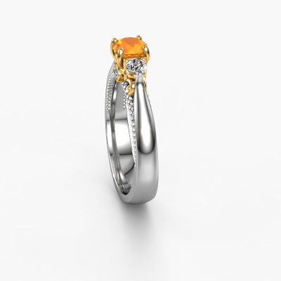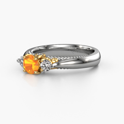 This 14 Carat white gold ring is called Tiffani and is set with 5 mm citrin. This exclusive white gold 3-stone engagement ring is a true work of art! The ornaments are crafted with a lot of patience and great passion. In order to create this ring with great precision, this craft requires a keen eye and skilful hand. A challenge which ignites a fire in our expert goldsmith. The exquisite citrin are set in a special way so they stand out even more. This gives the ring an even more glamorous appearance. The ajour engagement ring is actually unique on its own because of the gemstones which we carefully select especially for this ring. On top of that you select the precious metals which will be used to create a unique ring for the most extraordinary woman in your life! This jewel is made just for you by our master goldsmiths in our own studio.After receiving your order, our goldsmiths will passionately start the creative process of making your engagement ring in our own studio. Because we don't have a big stockpile, these costs will not be passed on to you. Our pricing is proof of that! We offer top quality jewels at lowest price, guaranteed.Have you found a specific engagement ring somewhere which you would like to give to your loved one? Please feel free to express your wishes to our jewel designers because we would be honoured to turn your design into a unique engagement ring. You can follow the development of your ring design because we use 3D drawings. This gives you a realistic preview of how your design will look. You can also preorder a dummy. A dummy is a plastic ring, which can be shaped according your ring design. You can try it on and check if its width and size are suitable for you. We will gladly send you a non-binding offer, based on a fair price/ quality ratio. It will amaze you, considering the quality of the ring and gemstones.To make it easier for you, we offer a 30 day return policy. Check our terms and conditions.