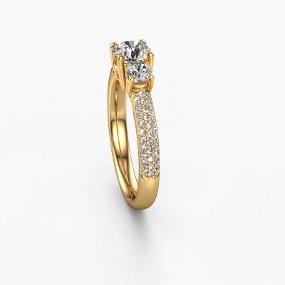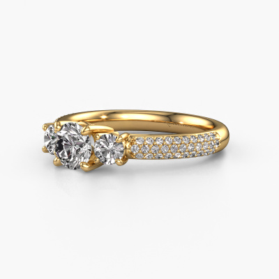 This 14 Carat gold ring is called Marielle RND and is set with 1.27 crt diamond. This exclusive gold 3-stone engagement ring is a true work of art! The ornaments are crafted with a lot of patience and great passion. In order to create this ring with great precision, this craft requires a keen eye and skilful hand. A challenge which ignites a fire in our expert goldsmith. The exquisite diamonds are set in a special way so they stand out even more. This gives the ring an even more glamorous appearance. The tasteful engagement ring is actually unique on its own because of the gemstones which we carefully select especially for this ring. On top of that you select the precious metals which will be used to create a unique ring for the most extraordinary woman in your life! This jewel is made with passion and love by one of our master goldsmiths.By using a combination of the latest modern techniques, combined with ancient crafting, we can make all our engagement rings in our own studio. Each jewel is made to order. This is advantageous because we can offer you a price you won't find anywhere else.Our designers and goldsmiths work together each day, creating new jewels. Perhaps you have found a nice exclusive engagement ring somewhere, which can be used to customize your unique ring. Please feel free to contact us. We will make you an offer, based on a fair price/ quality ratio, which will amaze you.To make it easier for you, we offer a 30 day return policy. Check our terms and conditions.