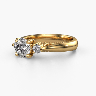 This 14 Carat gold ring is called Tiffani and is set with 1.24 crt diamond. This exclusive gold 3-stone engagement ring is a true work of art! The ornaments are crafted with a lot of patience and great passion. In order to create this ring with great precision, this craft requires a keen eye and skilful hand. A challenge which ignites a fire in our expert goldsmith. The exquisite diamonds are set in a special way so they stand out even more. This gives the ring an even more glamorous appearance. The ajour engagement ring is actually unique on its own because of the gemstones which we carefully select especially for this ring. On top of that you select the precious metals which will be used to create a unique ring for the most extraordinary woman in your life! This jewel is made just for you by our master goldsmiths in our own studio.After receiving your order, our goldsmiths will passionately start the creative process of making your engagement ring in our own studio. Because we don't have a big stockpile, these costs will not be passed on to you. Our pricing is proof of that! We offer top quality jewels at lowest price, guaranteed.Have you found a specific engagement ring somewhere which you would like to give to your loved one? Please feel free to express your wishes to our jewel designers because we would be honoured to turn your design into a unique engagement ring. You can follow the development of your ring design because we use 3D drawings. This gives you a realistic preview of how your design will look. You can also preorder a dummy. A dummy is a plastic ring, which can be shaped according your ring design. You can try it on and check if its width and size are suitable for you. We will gladly send you a non-binding offer, based on a fair price/ quality ratio. It will amaze you, considering the quality of the ring and gemstones.To make it easier for you, we offer a 30 day return policy. Check our terms and conditions.