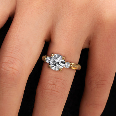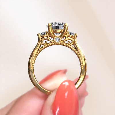 This 14 Carat gold ring is called Tiffani and is set with 2.24 crt diamond. This exclusive gold 3-stone engagement ring is a true work of art! The ornaments are crafted with a lot of patience and great passion. In order to create this ring with great precision, this craft requires a keen eye and skilful hand. A challenge which ignites a fire in our expert goldsmith. The exquisite diamonds are set in a special way so they stand out even more. This gives the ring an even more glamorous appearance. The ajour engagement ring is actually unique on its own because of the gemstones which we carefully select especially for this ring. On top of that you select the precious metals which will be used to create a unique ring for the most extraordinary woman in your life! This jewel is made just for you by our master goldsmiths in our own studio.After receiving your order, our goldsmiths will passionately start the creative process of making your engagement ring in our own studio. Because we don't have a big stockpile, these costs will not be passed on to you. Our pricing is proof of that! We offer top quality jewels at lowest price, guaranteed.Have you found a specific engagement ring somewhere which you would like to give to your loved one? Please feel free to express your wishes to our jewel designers because we would be honoured to turn your design into a unique engagement ring. You can follow the development of your ring design because we use 3D drawings. This gives you a realistic preview of how your design will look. You can also preorder a dummy. A dummy is a plastic ring, which can be shaped according your ring design. You can try it on and check if its width and size are suitable for you. We will gladly send you a non-binding offer, based on a fair price/ quality ratio. It will amaze you, considering the quality of the ring and gemstones.To make it easier for you, we offer a 30 day return policy. Check our terms and conditions.