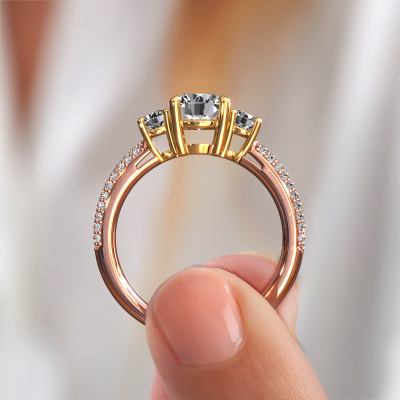 This 14 Carat rose gold ring is called Marielle RND and is set with 1.67 crt diamond. This exclusive rose gold 3-stone engagement ring is a true work of art! The ornaments are crafted with a lot of patience and great passion. In order to create this ring with great precision, this craft requires a keen eye and skilful hand. A challenge which ignites a fire in our expert goldsmith. The exquisite diamonds are set in a special way so they stand out even more. This gives the ring an even more glamorous appearance. The tasteful engagement ring is actually unique on its own because of the gemstones which we carefully select especially for this ring. On top of that you select the precious metals which will be used to create a unique ring for the most extraordinary woman in your life! This jewel is made with passion and love by one of our master goldsmiths.By using a combination of the latest modern techniques, combined with ancient crafting, we can make all our engagement rings in our own studio. Each jewel is made to order. This is advantageous because we can offer you a price you won't find anywhere else.Our designers and goldsmiths work together each day, creating new jewels. Perhaps you have found a nice exclusive engagement ring somewhere, which can be used to customize your unique ring. Please feel free to contact us. We will make you an offer, based on a fair price/ quality ratio, which will amaze you.To make it easier for you, we offer a 30 day return policy. Check our terms and conditions.