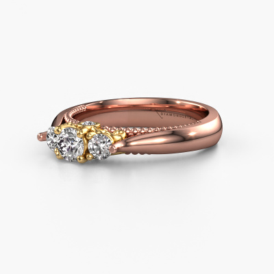 This 14 Carat rose gold ring is called Tiffani and is set with 0.49 crt diamond. This exclusive rose gold 3-stone engagement ring is a true work of art! The ornaments are crafted with a lot of patience and great passion. In order to create this ring with great precision, this craft requires a keen eye and skilful hand. A challenge which ignites a fire in our expert goldsmith. The exquisite diamonds are set in a special way so they stand out even more. This gives the ring an even more glamorous appearance. The ajour engagement ring is actually unique on its own because of the gemstones which we carefully select especially for this ring. On top of that you select the precious metals which will be used to create a unique ring for the most extraordinary woman in your life! This jewel is made just for you by our master goldsmiths in our own studio.After receiving your order, our goldsmiths will passionately start the creative process of making your engagement ring in our own studio. Because we don't have a big stockpile, these costs will not be passed on to you. Our pricing is proof of that! We offer top quality jewels at lowest price, guaranteed.Have you found a specific engagement ring somewhere which you would like to give to your loved one? Please feel free to express your wishes to our jewel designers because we would be honoured to turn your design into a unique engagement ring. You can follow the development of your ring design because we use 3D drawings. This gives you a realistic preview of how your design will look. You can also preorder a dummy. A dummy is a plastic ring, which can be shaped according your ring design. You can try it on and check if its width and size are suitable for you. We will gladly send you a non-binding offer, based on a fair price/ quality ratio. It will amaze you, considering the quality of the ring and gemstones.To make it easier for you, we offer a 30 day return policy. Check our terms and conditions.