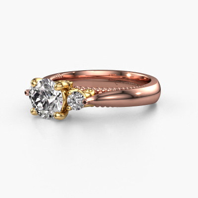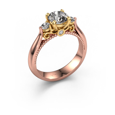 This 14 Carat rose gold ring is called Tiffani and is set with 1.24 crt diamond. This exclusive rose gold 3-stone engagement ring is a true work of art! The ornaments are crafted with a lot of patience and great passion. In order to create this ring with great precision, this craft requires a keen eye and skilful hand. A challenge which ignites a fire in our expert goldsmith. The exquisite diamonds are set in a special way so they stand out even more. This gives the ring an even more glamorous appearance. The ajour engagement ring is actually unique on its own because of the gemstones which we carefully select especially for this ring. On top of that you select the precious metals which will be used to create a unique ring for the most extraordinary woman in your life! This jewel is made just for you by our master goldsmiths in our own studio.After receiving your order, our goldsmiths will passionately start the creative process of making your engagement ring in our own studio. Because we don't have a big stockpile, these costs will not be passed on to you. Our pricing is proof of that! We offer top quality jewels at lowest price, guaranteed.Have you found a specific engagement ring somewhere which you would like to give to your loved one? Please feel free to express your wishes to our jewel designers because we would be honoured to turn your design into a unique engagement ring. You can follow the development of your ring design because we use 3D drawings. This gives you a realistic preview of how your design will look. You can also preorder a dummy. A dummy is a plastic ring, which can be shaped according your ring design. You can try it on and check if its width and size are suitable for you. We will gladly send you a non-binding offer, based on a fair price/ quality ratio. It will amaze you, considering the quality of the ring and gemstones.To make it easier for you, we offer a 30 day return policy. Check our terms and conditions.