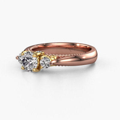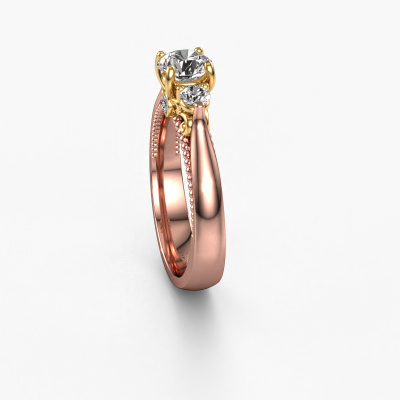 This 14 Carat rose gold ring is called Tiffani and is set with 0.84 crt diamond. This exclusive rose gold 3-stone engagement ring is a true work of art! The ornaments are crafted with a lot of patience and great passion. In order to create this ring with great precision, this craft requires a keen eye and skilful hand. A challenge which ignites a fire in our expert goldsmith. The exquisite diamonds are set in a special way so they stand out even more. This gives the ring an even more glamorous appearance. The ajour engagement ring is actually unique on its own because of the gemstones which we carefully select especially for this ring. On top of that you select the precious metals which will be used to create a unique ring for the most extraordinary woman in your life! This jewel is made just for you by our master goldsmiths in our own studio.After receiving your order, our goldsmiths will passionately start the creative process of making your engagement ring in our own studio. Because we don't have a big stockpile, these costs will not be passed on to you. Our pricing is proof of that! We offer top quality jewels at lowest price, guaranteed.Have you found a specific engagement ring somewhere which you would like to give to your loved one? Please feel free to express your wishes to our jewel designers because we would be honoured to turn your design into a unique engagement ring. You can follow the development of your ring design because we use 3D drawings. This gives you a realistic preview of how your design will look. You can also preorder a dummy. A dummy is a plastic ring, which can be shaped according your ring design. You can try it on and check if its width and size are suitable for you. We will gladly send you a non-binding offer, based on a fair price/ quality ratio. It will amaze you, considering the quality of the ring and gemstones.To make it easier for you, we offer a 30 day return policy. Check our terms and conditions.