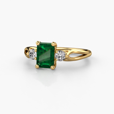This 14 Carat gold ring is called Amie EME and is set with 7x5 mm emerald. This exclusive gold 3-stone engagement ring is a true work of art! The ornaments are crafted with a lot of patience and great passion. In order to create this ring with great precision, this craft requires a keen eye and skilful hand. A challenge which ignites a fire in our expert goldsmith. The exquisite emerald are set in a special way so they stand out even more. This gives the ring an even more glamorous appearance. The tasteful engagement ring is actually unique on its own because of the gemstones which we carefully select especially for this ring. On top of that you select the precious metals which will be used to create a unique ring for the most extraordinary woman in your life! This jewel is made to shine bright around your finger. Each jewel is hand made with love by our goldsmiths.Are you on a budget? Please feel free to contact us, so we can go discuss your options. We offer our engagement rings at guaranteed best price, because we make them to order. You won't find such a price anywhere else!Our team adds new designs to our online collection daily. Our designers and goldsmiths work together in creating the best design. We strive to offer a diverse collection of jewels. Perhaps you have a specific jewel design in mind. One you came across somewhere. Please contact us for a free consultation. We will make you an offer, based on a fair price/ quality ratio, that will baffle you.To make it easier for you, we offer a 30 day return policy. Check our terms and conditions.