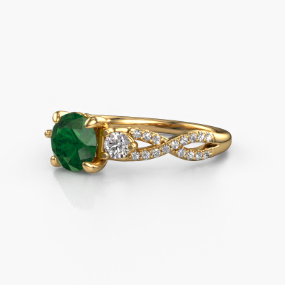 This 14 Carat gold ring is called Marilou RND and is set with 6.5 mm emerald. This exclusive gold 3-stone engagement ring is a true work of art! The ornaments are crafted with a lot of patience and great passion. In order to create this ring with great precision, this craft requires a keen eye and skilful hand. A challenge which ignites a fire in our expert goldsmith. The exquisite emerald are set in a special way so they stand out even more. This gives the ring an even more glamorous appearance. The split band engagement ring is actually unique on its own because of the gemstones which we carefully select especially for this ring. On top of that you select the precious metals which will be used to create a unique ring for the most extraordinary woman in your life! This jewel is made just for you, with attention to detail and design.Are you on a budget? Please feel free to contact us, so we can go discuss your options. We offer our engagement rings at guaranteed best price, because we make them to order. You won't find such a price anywhere else!Have you found a specific engagement ring somewhere which you would like to give to your loved one? Please feel free to express your wishes to our jewel designers because we would be honoured to turn your design into a fantasy engagement ring. You can follow the development of your ring design because we use 3D drawings. This gives you a realistic preview of how your design will look. You can also preorder a dummy. A dummy is a plastic ring, which can be shaped according your ring design. You can try it on and check if its width and size are suitable for you. We will gladly send you a non-binding offer, based on a fair price/ quality ratio. It will amaze you, considering the quality of the ring and gemstones.To make it easier for you, we offer a 30 day return policy. Check our terms and conditions.