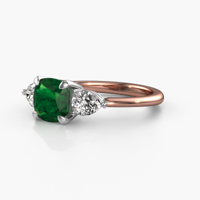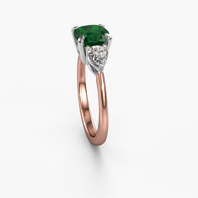 This 14 Carat rose gold ring is called Chanou CUS and is set with 7 mm emerald. This exclusive rose gold 3-stone engagement ring is a true work of art! The ornaments are crafted with a lot of patience and great passion. In order to create this ring with great precision, this craft requires a keen eye and skilful hand. A challenge which ignites a fire in our expert goldsmith. The exquisite emerald are set in a special way so they stand out even more. This gives the ring an even more glamorous appearance. The pretty engagement ring is actually unique on its own because of the gemstones which we carefully select especially for this ring. On top of that you select the precious metals which will be used to create a unique ring for the most extraordinary woman in your life! This jewel is made to shine bright around your finger. Each jewel is hand made with love by our goldsmiths.After receiving your order, our goldsmiths will start the creative process of making your Chanou CUS engagement ring. We don't keep stock. This is advantageous because these costs will not be passed on to you. Therefore, we can offer jewellery at exceptionally low prices.Our designers and goldsmiths work together each day, creating new jewels. Perhaps you have found a nice exclusive engagement ring somewhere, which can be used to customize your unique ring. Please feel free to contact us. We will make you an offer, based on a fair price/ quality ratio, which will amaze you.To make it easier for you, we offer a 30 day return policy. Check our terms and conditions.