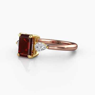 This 14 Carat rose gold ring is called Chanou EME and is set with 7.5x5.5 mm garnet. For you, there is only one person in your life who stands out in a crowd. Only one that makes your heart skip a beat. A true gem! She, above all others, deserves a special gift. A unique customized jewel made in her honour. We believe this ring is perfect for your special moment. Each detail of this exclusive rose gold 3-stone engagement ring is selected by hand, crafted and polished by our expert goldsmith in our own artisan studio. We strive to achieve the perfect design and composition of the ring, so it enhances the unique features of our garnet, and lets them shine even brighter. It takes a lot of precision to make but in the end it pays off because of the sheer beauty of the ring. And that is our main goal. It's what gets us excited. The great thing about our online tool is, that you can design your own jewellery into a unique, personalized piece. This unique tasteful engagement ring is created with the precious metal combination of rose gold and gold. But of course you are completely free to select other colours. Each piece of jewellery is made just for you by our master goldsmiths in our own studio.By using a combination of the latest modern techniques, combined with ancient crafting, we can make all our engagement rings in our own studio. Each jewel is made to order. This is advantageous because we can offer you a price you won't find anywhere else.Our designers and goldsmiths work together each day, creating new jewels. Perhaps you have found a nice unique engagement ring somewhere, which can be used to customize your unique ring. Please feel free to contact us. We will make you an offer, based on a fair price/ quality ratio, which will amaze you.To make it easier for you, we offer a 30 day return policy. Check our terms and conditions.