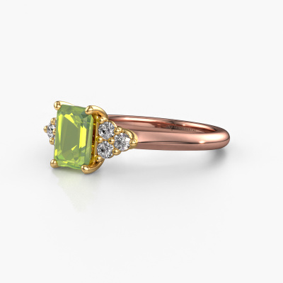 This 14 Carat rose gold ring is called Felipa EME and is set with 7x5 mm peridot. For you, there is only one person in your life who stands out in a crowd. Only one that makes your heart skip a beat. A true gem! She, above all others, deserves a special gift. A unique customized jewel made in her honour. We believe this ring is perfect for your special moment. Each detail of this exclusive rose gold 3-stone engagement ring is selected by hand, crafted and polished by our expert goldsmith in our own artisan studio. We strive to achieve the perfect design and composition of the ring, so it enhances the unique features of our peridot, and lets them shine even brighter. It takes a lot of precision to make but in the end it pays off because of the sheer beauty of the ring. And that is our main goal. It's what gets us excited. The great thing about our online tool is, that you can design your own jewellery into a unique, personalized piece. This unique tasteful engagement ring is created with the precious metal combination of rose gold and gold. But of course you are completely free to select other colours. Each piece of jewellery is made to shine bright around your finger. Each jewel is hand made with love by our goldsmiths.By using a combination of the latest modern techniques, combined with ancient crafting, we can make all our engagement rings in our own studio. Each jewel is made to order. This is advantageous because we can offer you a price you won't find anywhere else.Our team adds new designs to our online collection daily. Our designers and goldsmiths work together in creating the best design. We strive to offer a diverse collection of jewels. Perhaps you have a specific jewel design in mind. One you came across somewhere. Please contact us for a free consultation. We will make you an offer, based on a fair price/ quality ratio, that will baffle you.To make it easier for you, we offer a 30 day return policy. Check our terms and conditions.