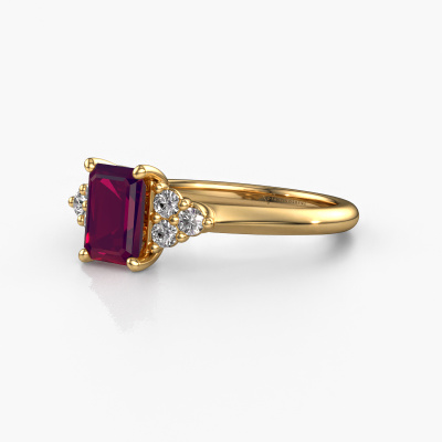 This 14 Carat gold ring is called Felipa EME and is set with 7x5 mm rhodolite. For you, there is only one person in your life who stands out in a crowd. Only one that makes your heart skip a beat. A true gem! She, above all others, deserves a special gift. A unique customized jewel made in her honour. We believe this ring is perfect for your special moment. Each detail of this exclusive gold 3-stone engagement ring is selected by hand, crafted and polished by our expert goldsmith in our own artisan studio. We strive to achieve the perfect design and composition of the ring, so it enhances the unique features of our rhodolite, and lets them shine even brighter. It takes a lot of precision to make but in the end it pays off because of the sheer beauty of the ring. And that is our main goal. It's what gets us excited. The great thing about our online tool is, that you can design your own jewellery into a unique, personalized piece. This unique tasteful engagement ring is created with the precious metal combination of gold and gold. But of course you are completely free to select other colours. Each piece of jewellery is made to shine bright around your finger. Each jewel is hand made with love by our goldsmiths.By using a combination of the latest modern techniques, combined with ancient crafting, we can make all our engagement rings in our own studio. Each jewel is made to order. This is advantageous because we can offer you a price you won't find anywhere else.Our team adds new designs to our online collection daily. Our designers and goldsmiths work together in creating the best design. We strive to offer a diverse collection of jewels. Perhaps you have a specific jewel design in mind. One you came across somewhere. Please contact us for a free consultation. We will make you an offer, based on a fair price/ quality ratio, that will baffle you.To make it easier for you, we offer a 30 day return policy. Check our terms and conditions.