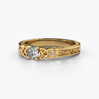 This 14 Carat gold ring is called Gillian and is set with 0.32 crt diamond. Is your girlfriend hooked on vintage? Then this gold ajour engagement ring will surely match her style perfectly. A trendy ring with just a hint of vintage adornment. A truly stunning, romantic design! Especially when you customize your ring to your own liking. This vintage 3-stone engagement ring is set with stunning diamonds. As you can see, you are the boss in selecting a gemstone which matches the style of your girlfriend best. Each gemstone is carefully selected by our merchants whom are spread throughout the world. Nothing but the best gems for our expert goldsmith. After all, it is his crowning glory! Each jewel is made just for you, with attention to detail and design.After receiving your order, our goldsmiths will passionately start the creative process of making your engagement ring in our own studio. Because we don't have a big stockpile, these costs will not be passed on to you. Our pricing is proof of that! We offer top quality jewels at lowest price, guaranteed.Different styles of new rings are made daily by our team. Perhaps you have found a 3-stone engagement ring somewhere. One you would like to give to your loved one. Please feel free to share your thoughts and design with our jewel designers. We would love to turn your design into a vintage engagement ring. You can follow the development of your ring design because we use very detailed 3D drawings. On top of that, you can order a dummy of the design. A dummy is a plastic ring, which can be shaped according your ring design. You can try it on and check if the engagement ring is up to standard. We will gladly send you a non-binding offer, based on a fair price/ quality ratio. The offer will baffle you, considering the quality of the ring and gemstones.To make it easier for you, we offer a 30 day return policy. Check our terms and conditions.