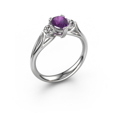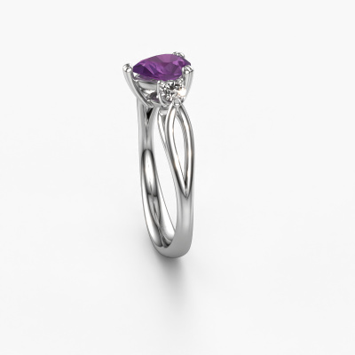 This platinum ring is called Amie per and is set with 7x5 mm amethyst. For you, there is only one person in your life who stands out in a crowd. Only one that makes your heart skip a beat. A true gem! She, above all others, deserves a special gift. A unique customized jewel made in her honour. We believe this ring is perfect for your special moment. Each detail of this exclusive platinum 3-stone engagement ring is selected by hand, crafted and polished by our expert goldsmith in our own artisan studio. We strive to achieve the perfect design and composition of the ring, so it enhances the unique features of our amethysten, and lets them shine even brighter. It takes a lot of precision to make but in the end it pays off because of the sheer beauty of the ring. And that is our main goal. It's what gets us excited. The great thing about our online tool is, that you can design your own jewellery into a unique, personalized piece. This unique special engagement ring is created with the precious metal combination of platinum and platinum. But of course you are completely free to select other colours. Each piece of jewellery is made by a team of passionate goldsmiths and jewel designers. This will make your crown jewel truly eye-catching.By using a combination of the latest modern techniques, combined with ancient crafting, we can make all our engagement rings in our own studio. Each jewel is made to order. This is advantageous because we can offer you a price you won't find anywhere else.Do you have a specific ring in mind? One you came across somewhere. Please feel free to tell us your wishes and we will turn your design into a unique engagement ring. You can follow the development of your ring design because we use 3D drawings. This gives you a realistic preview of your design. We will gladly send you a non-binding offer, based on a fair price/ quality ratio. It will amaze you.To make it easier for you, we offer a 30 day return policy. Check our terms and conditions.