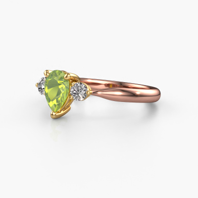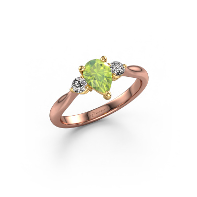 This 14 Carat rose gold ring is called Lieselot PER and is set with 7x5 mm peridot. For you, there is only one person in your life who stands out in a crowd. Only one that makes your heart skip a beat. A true gem! She, above all others, deserves a special gift. A unique customized jewel made in her honour. We believe this ring is perfect for your special moment. Each detail of this exclusive rose gold 3-stone engagement ring is selected by hand, crafted and polished by our expert goldsmith in our own artisan studio. We strive to achieve the perfect design and composition of the ring, so it enhances the unique features of our peridot, and lets them shine even brighter. It takes a lot of precision to make but in the end it pays off because of the sheer beauty of the ring. And that is our main goal. It's what gets us excited. The great thing about our online tool is, that you can design your own jewellery into a unique, personalized piece. This unique special engagement ring is created with the precious metal combination of rose gold and gold. But of course you are completely free to select other colours. Each piece of jewellery is made with passion and love by one of our master goldsmiths.Are you on a budget? Please feel free to contact us, so we can go discuss your options. We offer our engagement rings at guaranteed best price, because we make them to order. You won't find such a price anywhere else!Different styles of new rings are made daily by our team. Perhaps you have found a 3-stone engagement ring somewhere. One you would like to give to your loved one. Please feel free to share your thoughts and design with our jewel designers. We would love to turn your design into a fashionable engagement ring. You can follow the development of your ring design because we use very detailed 3D drawings. On top of that, you can order a dummy of the design. A dummy is a plastic ring, which can be shaped according your ring design. You can try it on and check if the engagement ring is up to standard. We will gladly send you a non-binding offer, based on a fair price/ quality ratio. The offer will baffle you, considering the quality of the ring and gemstones.To make it easier for you, we offer a 30 day return policy. Check our terms and conditions.