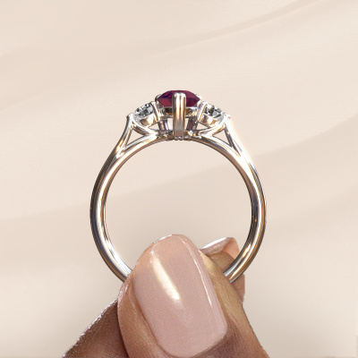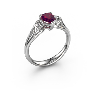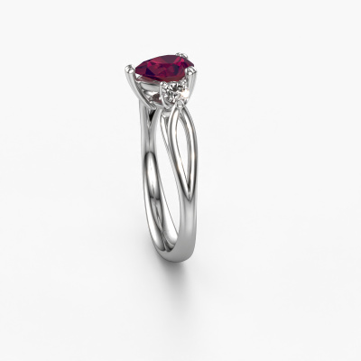 This platinum ring is called Amie per and is set with 7x5 mm rhodolite. For you, there is only one person in your life who stands out in a crowd. Only one that makes your heart skip a beat. A true gem! She, above all others, deserves a special gift. A unique customized jewel made in her honour. We believe this ring is perfect for your special moment. Each detail of this exclusive platinum 3-stone engagement ring is selected by hand, crafted and polished by our expert goldsmith in our own artisan studio. We strive to achieve the perfect design and composition of the ring, so it enhances the unique features of our rhodolite, and lets them shine even brighter. It takes a lot of precision to make but in the end it pays off because of the sheer beauty of the ring. And that is our main goal. It's what gets us excited. The great thing about our online tool is, that you can design your own jewellery into a unique, personalized piece. This unique special engagement ring is created with the precious metal combination of platinum and platinum. But of course you are completely free to select other colours. Each piece of jewellery is made by a team of passionate goldsmiths and jewel designers. This will make your crown jewel truly eye-catching.By using a combination of the latest modern techniques, combined with ancient crafting, we can make all our engagement rings in our own studio. Each jewel is made to order. This is advantageous because we can offer you a price you won't find anywhere else.Do you have a specific ring in mind? One you came across somewhere. Please feel free to tell us your wishes and we will turn your design into a unique engagement ring. You can follow the development of your ring design because we use 3D drawings. This gives you a realistic preview of your design. We will gladly send you a non-binding offer, based on a fair price/ quality ratio. It will amaze you.To make it easier for you, we offer a 30 day return policy. Check our terms and conditions.