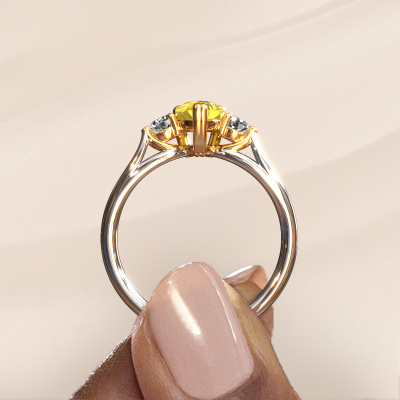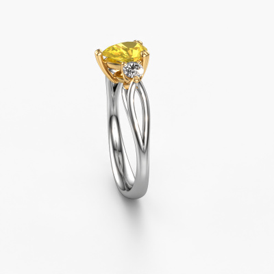 This 14 Carat white gold ring is called Amie per and is set with 7x5 mm yellow sapphire. For you, there is only one person in your life who stands out in a crowd. Only one that makes your heart skip a beat. A true gem! She, above all others, deserves a special gift. A unique customized jewel made in her honour. We believe this ring is perfect for your special moment. Each detail of this exclusive white gold 3-stone engagement ring is selected by hand, crafted and polished by our expert goldsmith in our own artisan studio. We strive to achieve the perfect design and composition of the ring, so it enhances the unique features of our yellow sapphire, and lets them shine even brighter. It takes a lot of precision to make but in the end it pays off because of the sheer beauty of the ring. And that is our main goal. It's what gets us excited. The great thing about our online tool is, that you can design your own jewellery into a unique, personalized piece. This unique special engagement ring is created with the precious metal combination of white gold and gold. But of course you are completely free to select other colours. Each piece of jewellery is made by a team of passionate goldsmiths and jewel designers. This will make your crown jewel truly eye-catching.By using a combination of the latest modern techniques, combined with ancient crafting, we can make all our engagement rings in our own studio. Each jewel is made to order. This is advantageous because we can offer you a price you won't find anywhere else.Do you have a specific ring in mind? One you came across somewhere. Please feel free to tell us your wishes and we will turn your design into a unique engagement ring. You can follow the development of your ring design because we use 3D drawings. This gives you a realistic preview of your design. We will gladly send you a non-binding offer, based on a fair price/ quality ratio. It will amaze you.To make it easier for you, we offer a 30 day return policy. Check our terms and conditions.