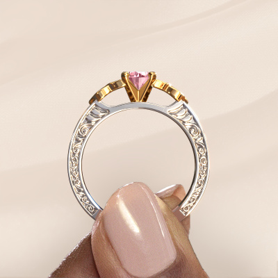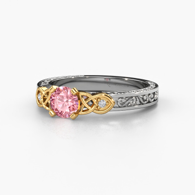 This 14 Carat white gold ring is called Gillian and is set with 5 mm pink lab grown diamond. Is your girlfriend hooked on vintage? Then this white gold ajour engagement ring will surely match her style perfectly. A trendy ring with just a hint of vintage adornment. A truly stunning, romantic design! Especially when you customize your ring to your own liking. This vintage 3-stone engagement ring is set with stunning pink lab grown diamonds. As you can see, you are the boss in selecting a gemstone which matches the style of your girlfriend best. Each gemstone is carefully selected by our merchants whom are spread throughout the world. Nothing but the best gems for our expert goldsmith. After all, it is his crowning glory! Each jewel is made just for you, with attention to detail and design.After receiving your order, our goldsmiths will passionately start the creative process of making your engagement ring in our own studio. Because we don't have a big stockpile, these costs will not be passed on to you. Our pricing is proof of that! We offer top quality jewels at lowest price, guaranteed.Different styles of new rings are made daily by our team. Perhaps you have found a 3-stone engagement ring somewhere. One you would like to give to your loved one. Please feel free to share your thoughts and design with our jewel designers. We would love to turn your design into a vintage engagement ring. You can follow the development of your ring design because we use very detailed 3D drawings. On top of that, you can order a dummy of the design. A dummy is a plastic ring, which can be shaped according your ring design. You can try it on and check if the engagement ring is up to standard. We will gladly send you a non-binding offer, based on a fair price/ quality ratio. The offer will baffle you, considering the quality of the ring and gemstones.To make it easier for you, we offer a 30 day return policy. Check our terms and conditions.